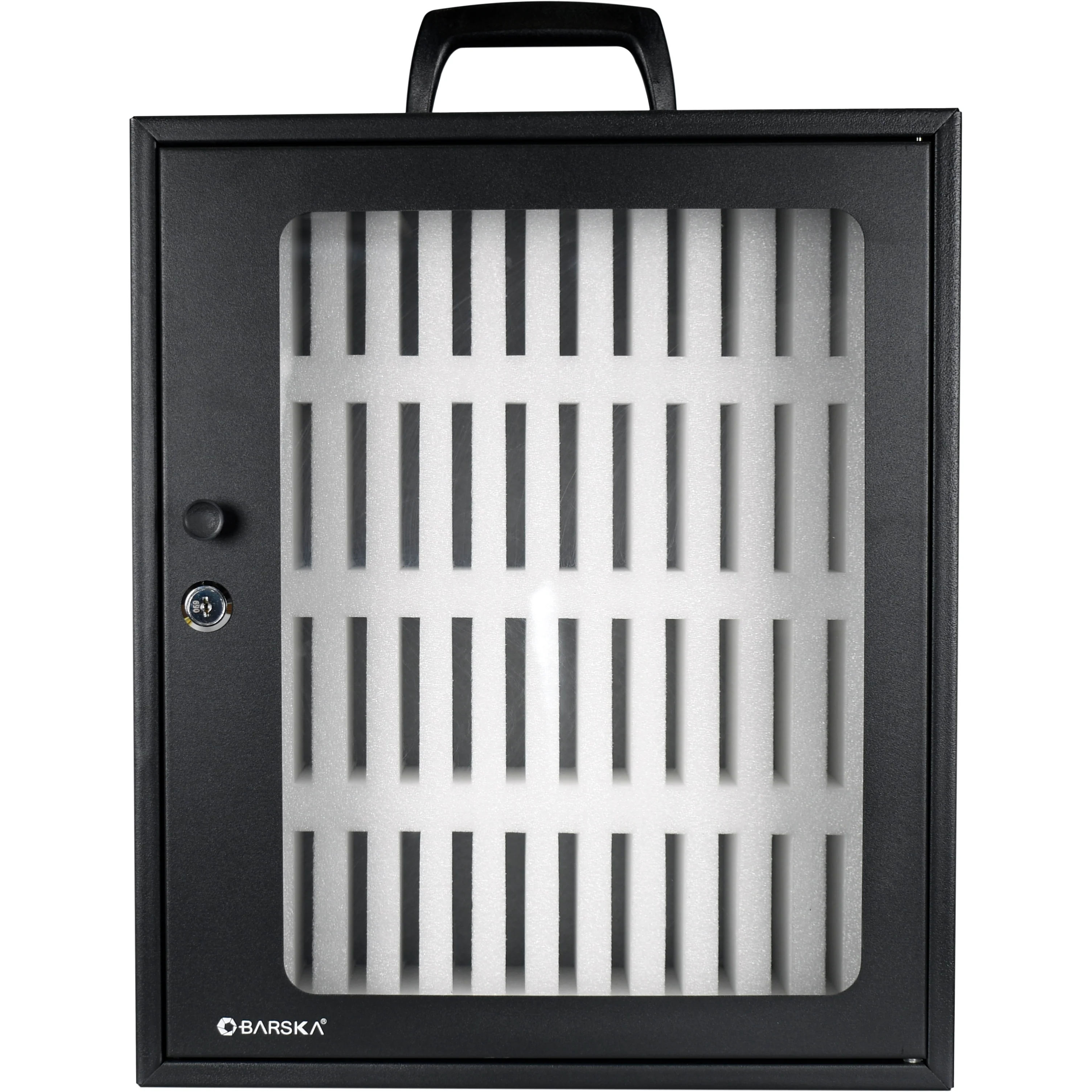 Maximize your workspace efficiency and device security with the 48 Capacity Smartphone (Cell Phone) Lock Box with Key Lock & Carry Handle by Barska. This versatile cabinet features 48 individual padded & numbered slots cut from rigid protective foam, each designed to securely hold smartphones (cell phones). Perfect for classrooms, offices, or any shared space, this cabinet helps keep track of smartphones (cell phones) while also preventing theft, damage, and clutter. The cabinet’s compact design allows for easy placement on desks or shelves, and its sturdy construction ensures long-lasting use. The port holes on either side allow for smartphones (cell phones) to be charged while stored. The Lock Box is equipped with pre-drilled mounting holes as well as a convenient carry handle for easy portability, making it ideal for transporting between locations or mounting securely in place on a wall.