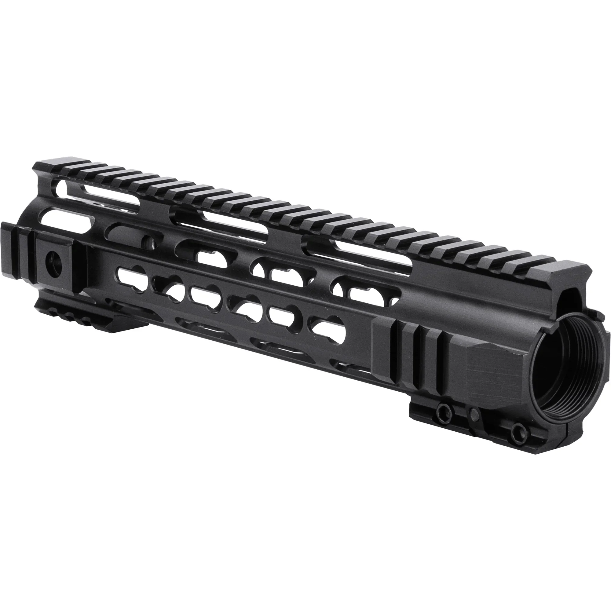The 10" Key Mod AR Hand Guard with Rails is a free floating hand guard that utilizes the Key Mod accessory attachment system for increased weight savings, modularity, and ergonomics. These Key Mod slots provide almost limitless combination of mounting points without the extra weight associated with similarly sized Picatinny rails. The Key Mod Slots are located at the 3, 6, and 9 o'clock positions, and the Picatinny top rail has been designed to fit seamlessly with a mil-spec upper receiver. This Key Mod Hand Guard is ideal for use with low-profile gas blocks on carbine, mid, or rifle-length gas systems.