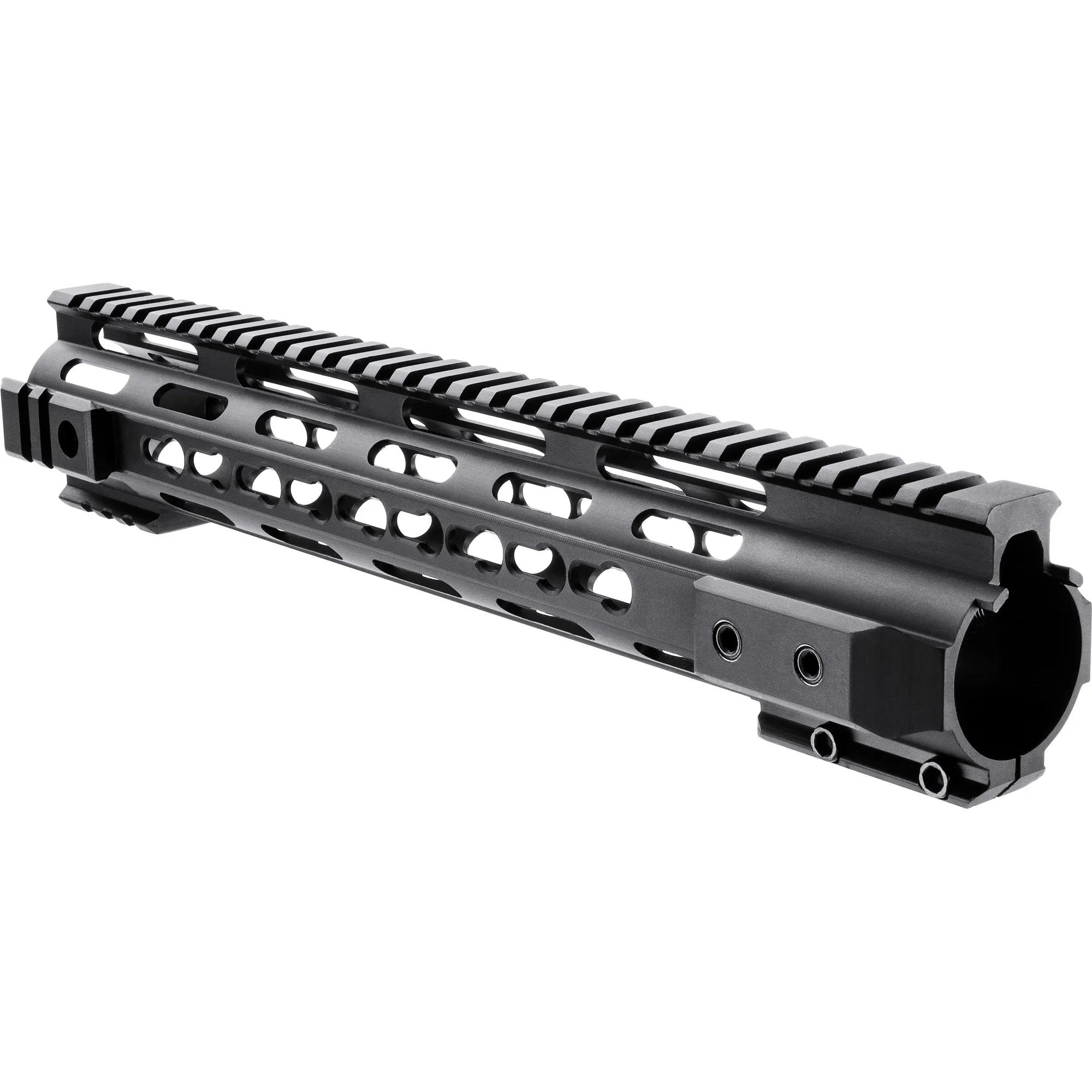 The 12" AR Key Mod Hand guard with Rails is a free floating hand guard that utilizes the Key Mod accessory attachment system for increased weight savings, modularity, and ergonomics. These Key Mod slots provide almost limitless combination of mounting points without the extra weight associated with similarly sized Picatinny rails. The Key Mod Slots are located at the 3, 6, and 9 o'clock positions, and the Picatinny top rail has been designed to fit seamlessly with an upper receiver. This Key Mod Hand guard is ideal for use with low-profile gas blocks on carbine, mid, or rifle-length gas systems.
