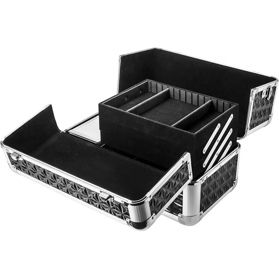 The Chéri Bliss line of Cosmetic Cases combine efficient & convenient transport with durability & style. Keep your cosmetics and other accessories in this aluminum frame carrying case with an attractive patterned black finish. The fully-lined interior contains 3 tiered compartments with adjustable dividers, as well as a reinforced aluminum container which is perfect for providing extra protection for tall items like aerosol cans, brushes, and more. The spacious bottom compartment is perfect for smaller makeup bags or larger cosmetic products. Take your cosmetic workstation on the go using either the aluminum handle or the adjustable carrying strap. Perfect for Hair & Makeup artists, VFX artists, cosplayers, and more.