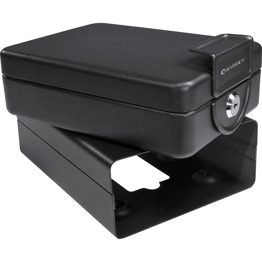 The Compact Key Lock Safe with Mounting Sleeve by Barska is perfect for locking your valuables inside your vehicle boat, home, RV or office or wherever you need to secure the small valuables. The steel mounting sleeve has six pre-drilled holes and mounting hardware is included for easy installation. Once the sleeve is mounted, the sleeve holds the lock box in place. Only the key will release the box from the sleeve. The lock box can be mounted almost anywhere, hidden away from prying eyes. When you want to move the safe, unlock the safe from the sleeve and take it with you. To open the safe insert and turn the key and lift safe door to open.