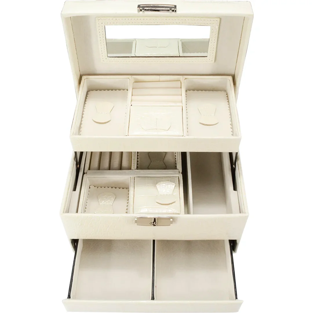 This elegant jewelry case features a sophisticated cream faux-crocodile finish complemented by a soft cream velvet interior. Designed for optimal organization, it offers three tiers of storage, including specialized compartments for rings and earrings, and a pull-out drawer divided into two spacious sections. A convenient portable mini case is included for travel. Furthermore, it incorporates a built-in mirror, a secure key lock, and a lid-mounted handle for effortless portability.